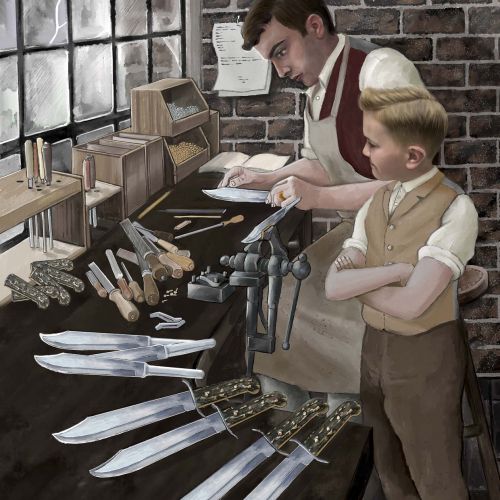 “A small bench near a window, and is provided with a number of tools to facilitate his operations - such as a vice, a small anvil, several files, steel burnishers, a drill-bow and drills for boring holes, a glazer coated with emery, a polisher coated with oil and rotten-stone, steel plates to act as gauges in making holes through the various parts of the knife, and numerous other appliances which we cannot enumerate. With the aid of these he shapes and adjusts his various pieces, fastens them with pins or rivets, files down these pins to give them a neat and level appearance, polishers every part after it is fixed; and, in short, he does to a pen knife what every watchmaker does to a watch- he makes very few of the parts, but he adjusts them all.”