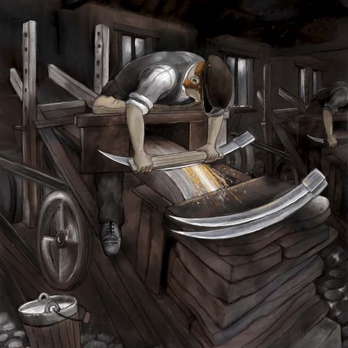 Local sandstone provided the grinders with their grinding wheels, with different size wheels used for different products and/or specialisms. By the 1900s, sandstone was phased out and replaced by carborundum.